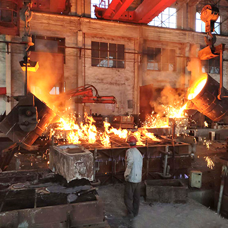出来上がった鋳型に、溶けた鉄(溶湯)を流し込む工程です。この工程で重要なのは「成分調整と温度管理」であり、材質に直結するポイントです。このうち成分調整については、シオノ鋳工では不良品を出さない成功率の高い方法を年々データ化し、ノウハウを磨いているので、あまり心配する必要はありません。温度管理については、クレーンの操作テクニックとスピード感、チームワークが重要になります。鉄は常温で固体になりますので、温度が下がってしまう前に複数並んだ鋳型に手際よく溶湯を流し込んでいきます。 また、その溶湯をつくる際にどのくらいの量の材料を溶解するかも重要で、少なすぎると足りなくなる、多すぎるとエネルギーの無駄遣い、といった風に、データ管理と知恵を用いて効率のよい仕事を目指します。